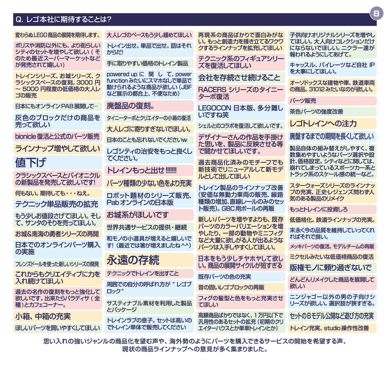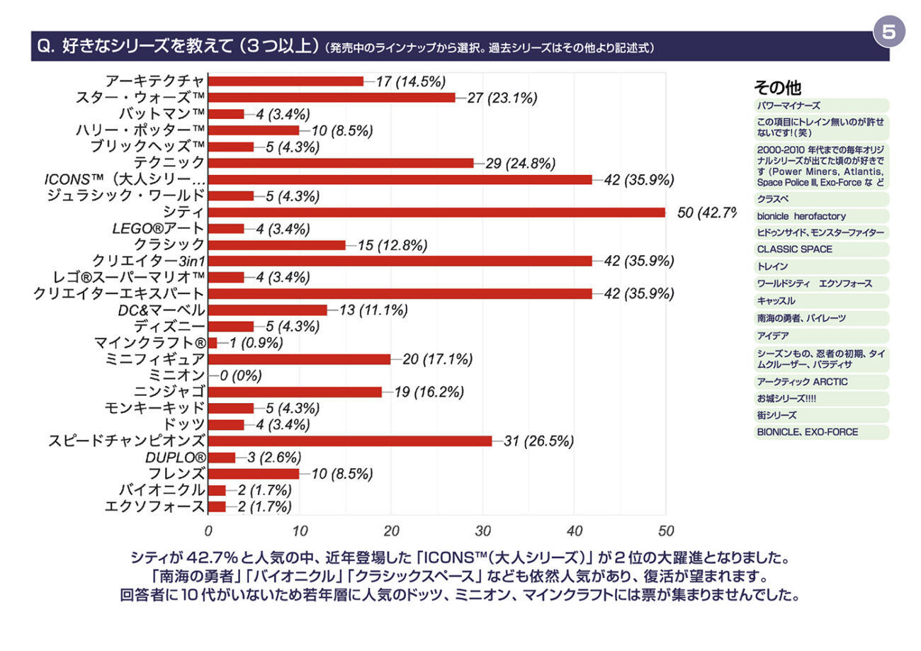 一方で、キャラクターものや可愛い系、小物系は少数派でした。これは好みの問題というより、回答者の年齢層とレゴ歴の長さが反映された結果でしょう。レゴが「世界を作る道具」として使われていることが、はっきり見えてきます。