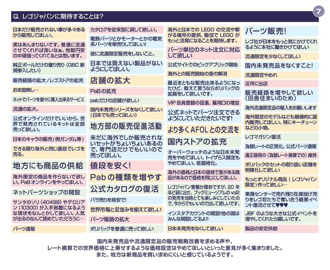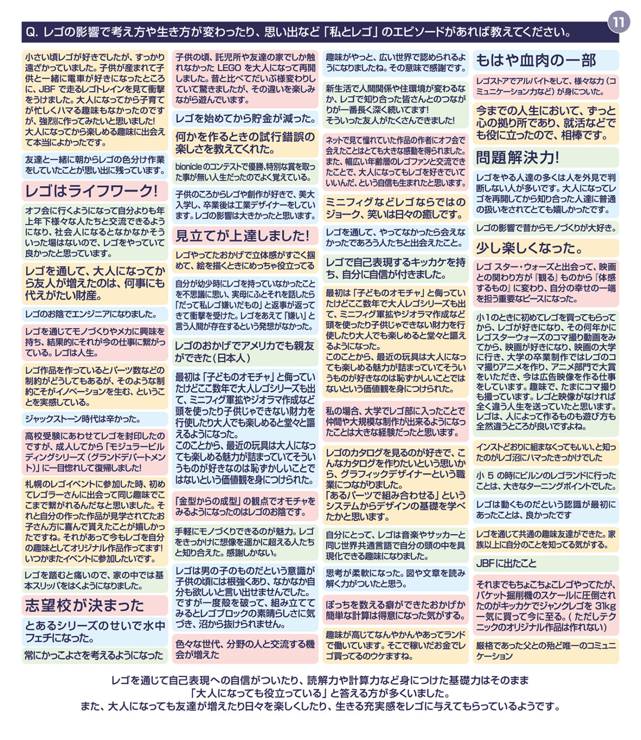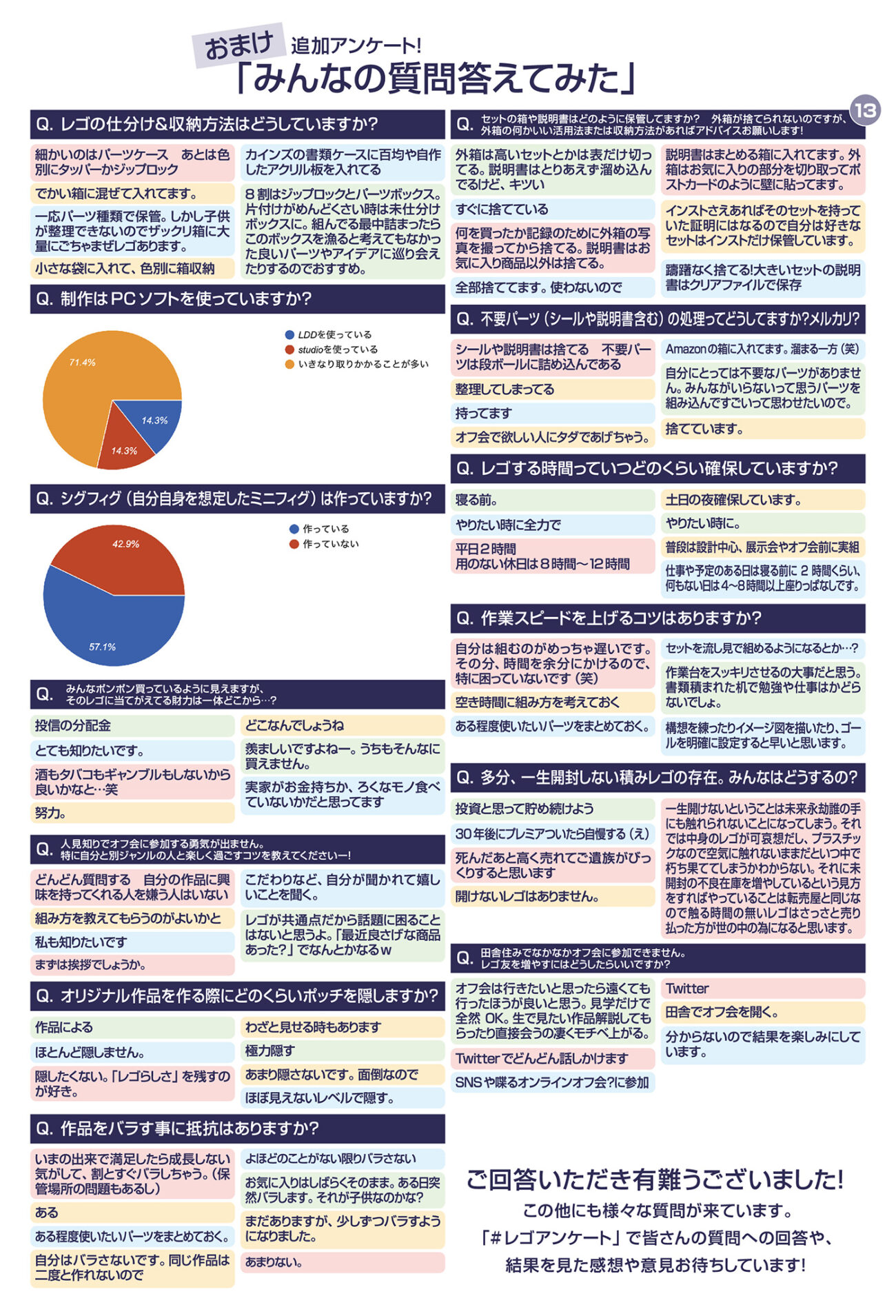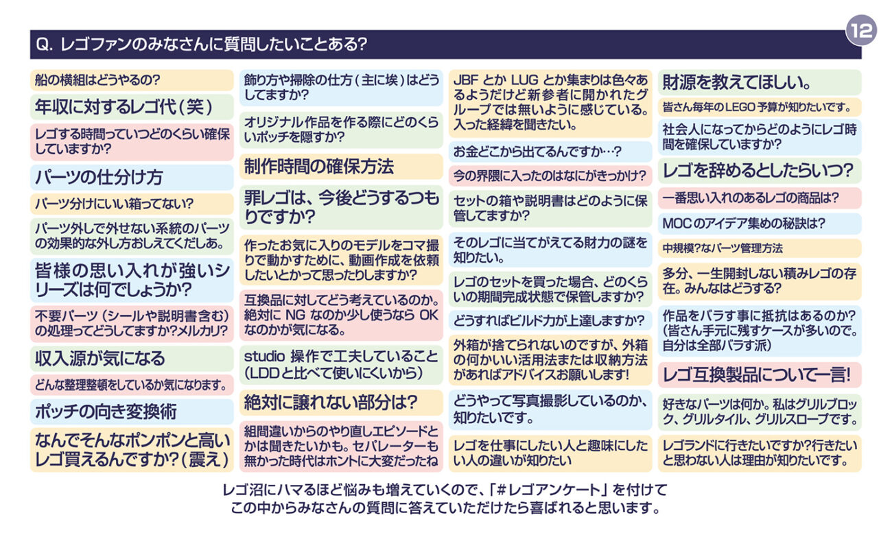 第二回アンケート全体を通して感じたのは、レゴが「楽しいから続けている」だけではないということです。悩み、困り、管理し、時には距離を取りながら、それでも戻ってきてしまう。